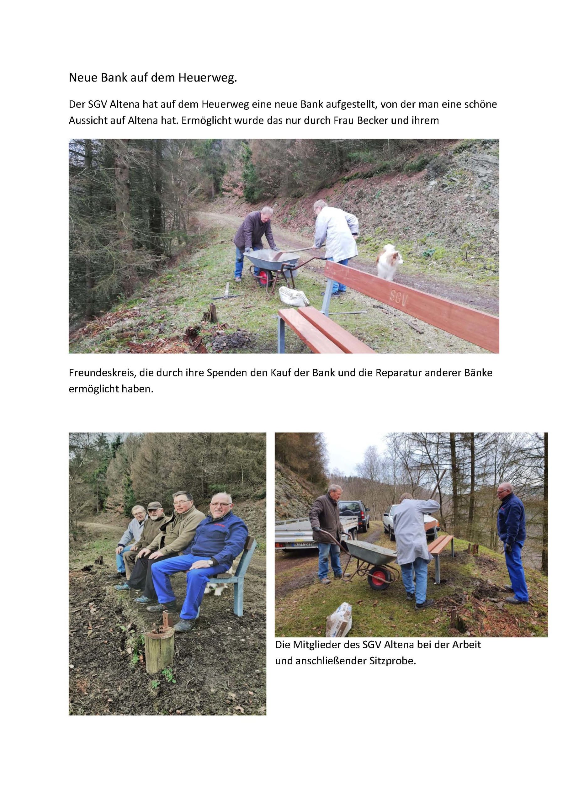 Wie bereits an anderer Stelle berichtet, haben fleißige Hände des SGV-Altena den Naturlehrpfad wieder attraktiver gestaltet, indem sie alle Schilder und Figuren mit einem neuen Anstrich versehen haben. Dieses geschah teilweise mit künstlerischen Fähigkeiten. Als diese Arbeiten fertig waren, haben sich die fleißigen Hände die vereinseigenen Bänke des SGV-Altena vorgenommen. Hier wurden Sitzbretter und Rückenlehnen aufgearbeitet und erneuert. Die dazu benötigten Gelder für das Holz, die Schrauben, das Schmirgelpapier, Pinsel und die Farben, wurden größtenteils als Geld- oder Sachspenden zur Verfügung gestellt. Namentlich sind für diese Aktion und Spendenbereitschaft insbesondere die Mitglieder Bernhard Heiduck, Ulrich Schwachta, Gerd Bratz und der Freundeskreis unseres Mitgliedes Frau Ingeborg Becker zu nennen. Ihnen gilt unser besonderer Dank.